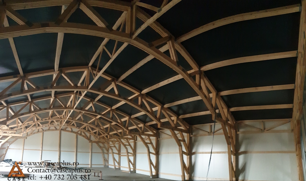 CASE A PLUS realizează și hale industriale pe structură de lemn. O astfel de hală economisește până la 50% din costurile de construcție: este mai ușoară, nu necesită fundații grele, iar timpul de execuție și montaj este redus.